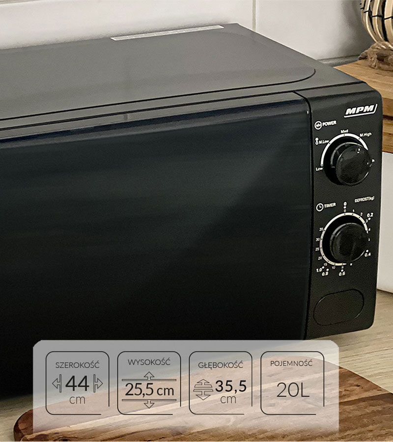 ПАРАМЕТРИ Розміри мікрохвильової печі МПМ-20-КММ-12 дозволяють розмістити її навіть в маленьких кухонних приміщеннях - ширина 44 см, висота 25,5 см, глибина 35 см. Ємність приладу - 20 літрів - гарантує приготування порцій для одного або двох осіб одночасно. Мікрохвильова піч працює на потужності 700 Вт.
