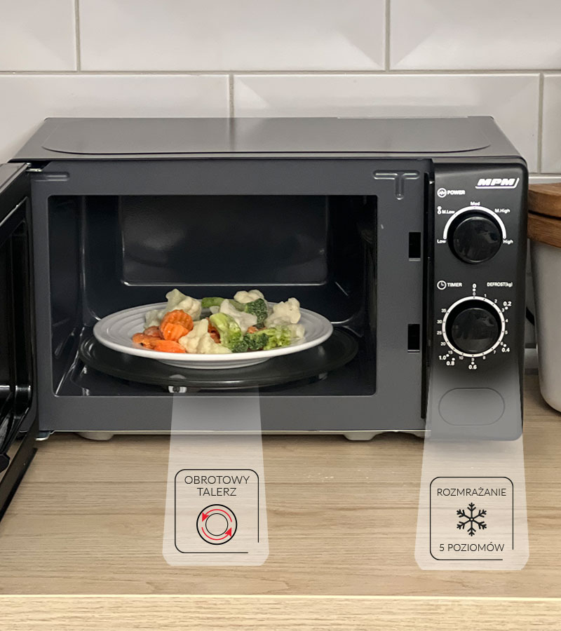 РОЗМОРОЖУВАННЯ Ви іноді забуваєте дістати їжу з морозилки на вечерю? Мікрохвильова піч MPM-20-KMM-12 має цілих 5 автоматичних програм розморожування різної ваги. За допомогою цієї функції ви можете розморозити продукти і цілі страви до 1 кг відразу після їх вилучення з морозильної камери. Оцініть вагу продукту або страви, покладіть його на тарілку в мікрохвильову піч і встановіть відповідний час за допомогою ручки. Продукти, розморожені в мікрохвильовій печі МПМ-20-КММ-12, зберігають свій натуральний смак.