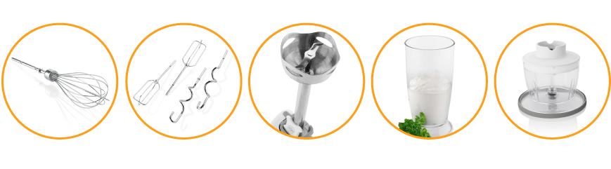 У комплект входять насадки для змішування та збивання, ручний блендер, ємність 500 мл, віночок, подрібнювач (з ємністю 300 мл) і закритий футляр для зручного зберігання обладнання