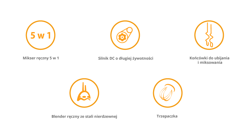 Ручний міксер 5 в 1 зачарує вас не лише своїм сучасним та елегантним зовнішнім виглядом, але й багатим оснащенням. З його допомогою можна збивати вершки, замішувати і місити тісто і навіть готувати начинку для сосисок.