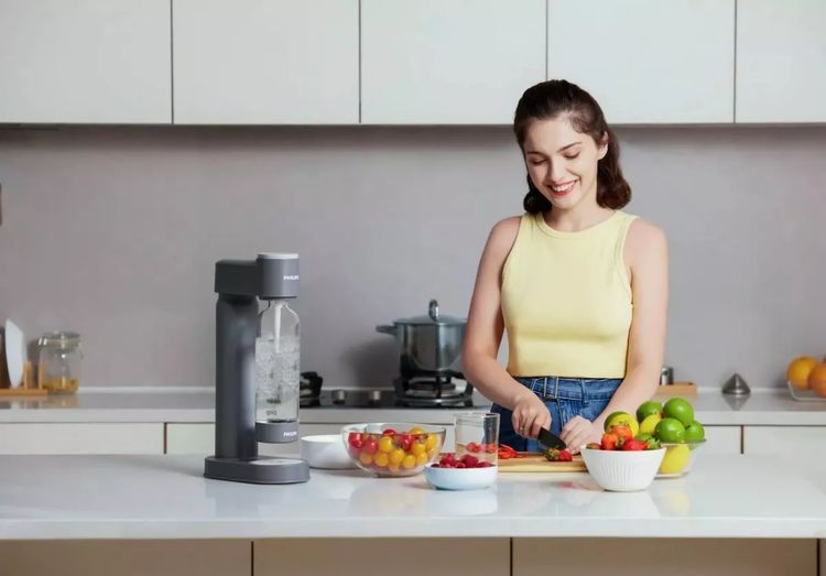 Більш корисний і свіжий варіант для заміни консервованих солодких газованих напоїв домашньою газованою водою. Три прості кроки, щоб отримати свіжу газовану воду вдома: наповніть, закрийте та натисніть!