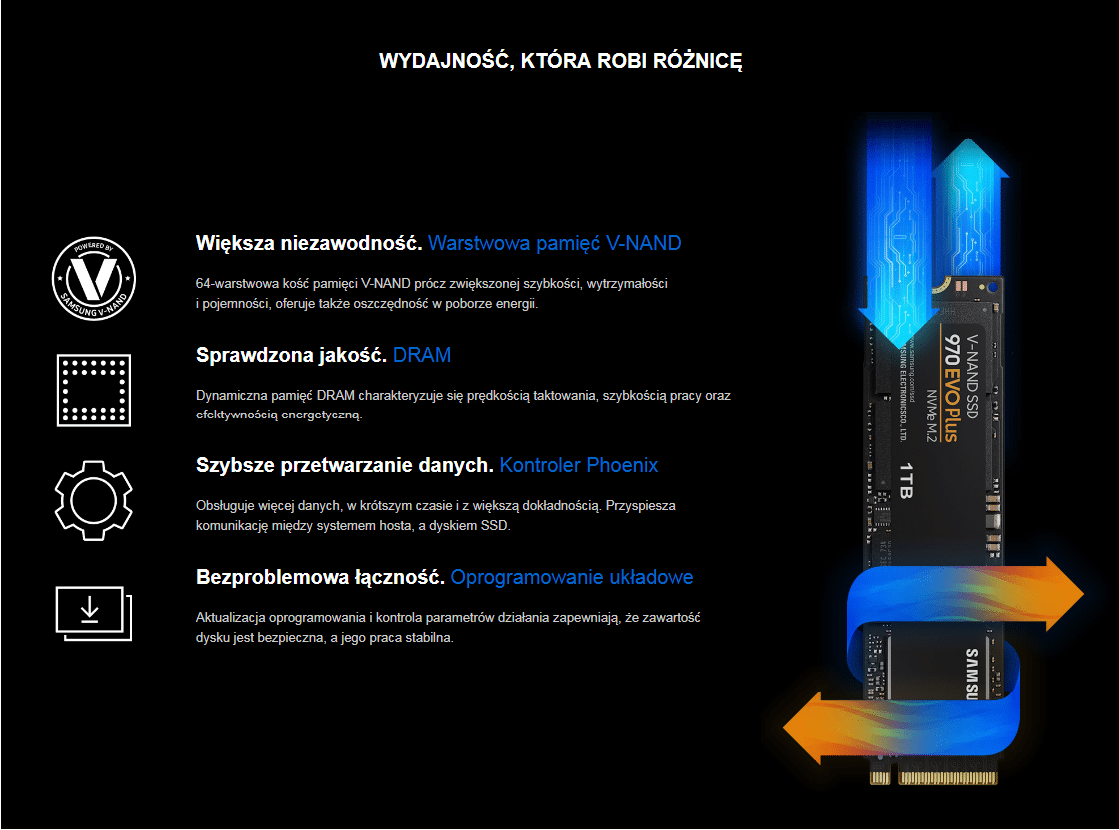 Ви хочете, щоб ваш ПК працював якнайкраще? Накопичувач 970 EVO Plus забезпечує швидкість послідовного читання/запису до 3500/3300 МБ/с, що на 53% швидше, ніж у 970 EVO**. Останнє рішення V-NAND, яке забезпечує покращену продуктивність NAND і покращену енергоефективність, а також оптимізоване мікропрограмне забезпечення, перевірений контролер Phoenix і інтелектуальний TurboWrite.