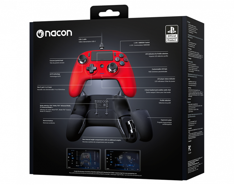 Інтерфейс програмного забезпечення для ПК* дозволяє створювати індивідуальні профілі для ваших ігрових потреб: повне відображення кнопок, чутливість джойстика та тригера, вібраційні двигуни тощо. Сьогодні найкращий дротовий контролер, розроблений NACON для конкуренції PS4™. Він також забезпечує повну сумісність з іграми для ПК. Завдяки різноманітним доступним ігровим режимам ви можете одразу поринути в дію в режимі PS4™ або підвищити свій рівень за допомогою персоналізованих профілів у режимі PS4-Advanced або PC-Advanced!