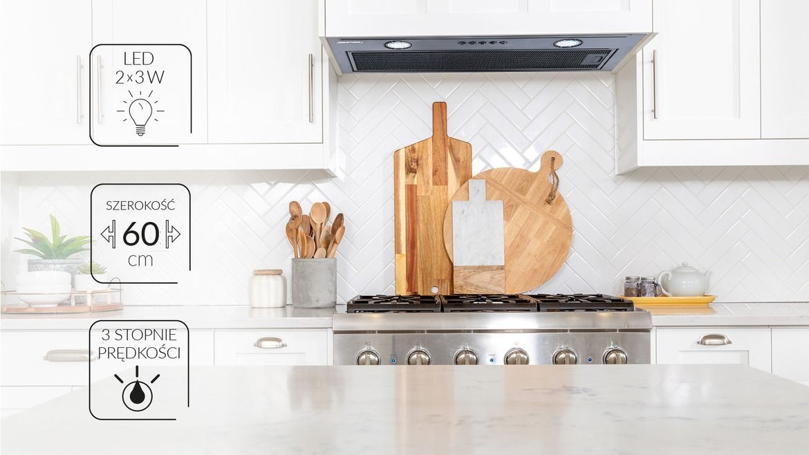 Вбудована витяжка MPM-60-OW-04 має мінімальну продуктивність 195 м3/год і максимальну 310 м3/год, мінімальний/максимальний рівень шуму становить 51/63 дБ при збереженні класу енергоспоживання C Оснащений ручним управлінням (кнопки знаходяться в направляючих тунелю), 3-ступеневим регулюванням швидкості, незалежним керуванням освітленням, світлодіодними лампочками 2 х 3 Вт з нейтральним кольором світла 3000 К.