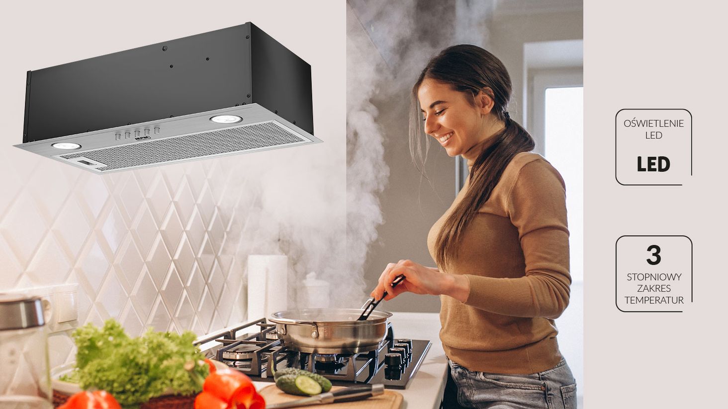 Витяжка є дуже важливим елементом кожної кухні. Усуває інтенсивні запахи приготування їжі та запобігає їх поширенню по дому. Витяжка вбудована MPM-60-OW-01N, колір сатин Inox, виготовлена зі сталі. Має 3-швидкісний діапазон і зручне кнопкове управління. Крім того, пристрій оснащений автономним світлодіодним освітленням, яке додасть атмосфери вашій кухні під час вечірнього приготування їжі.