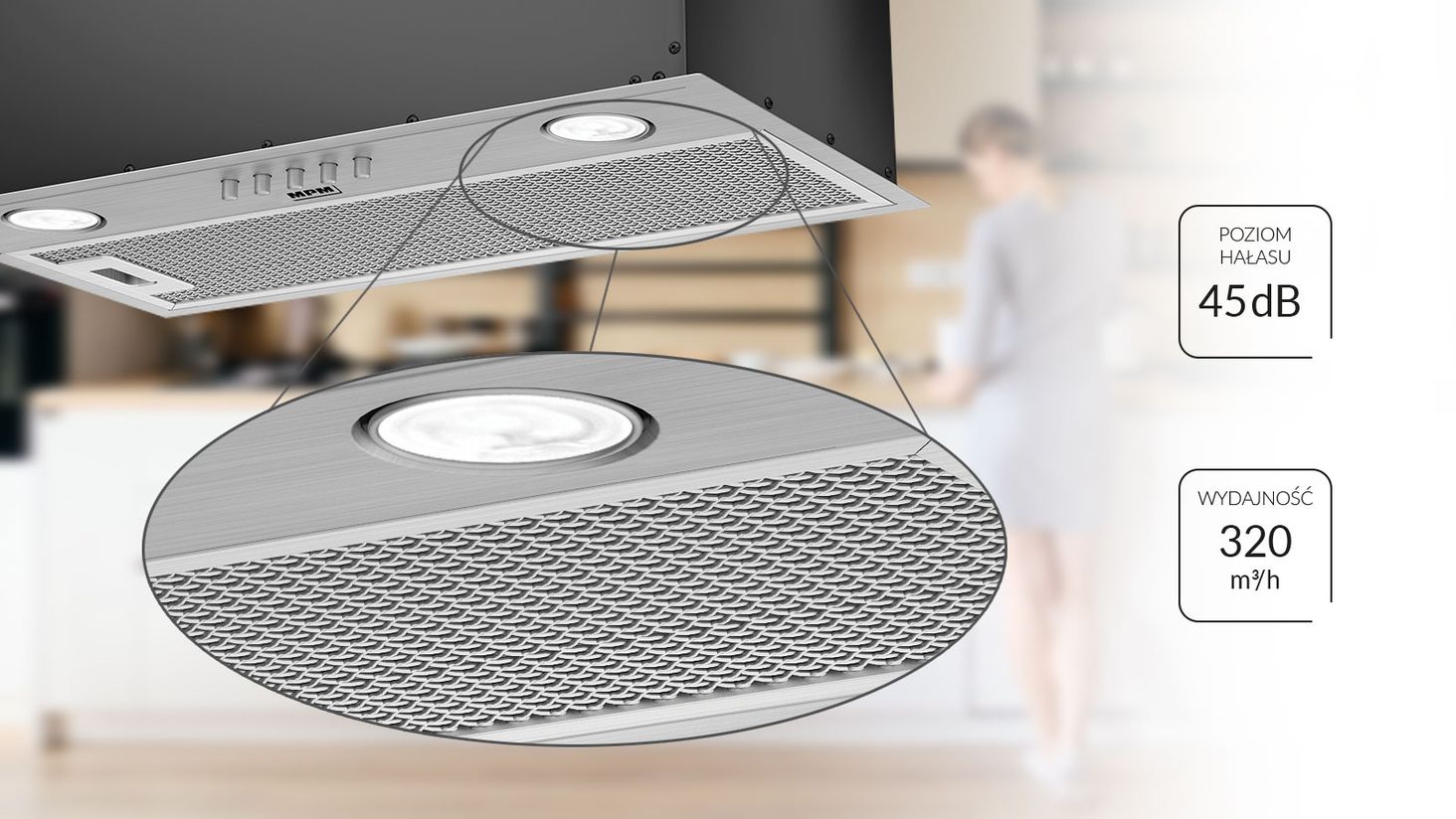 Вбудована витяжка MPM-60-OW-01N оснащена алюмінієвим фільтром в колір витяжки. Фільтр можна мити в посудомийній машині, тому підтримувати його в чистоті не проблема. Вбудована витяжка MPM-60-OW-01N не тільки тиха (мін. 45 дБ), але й дуже ефективна. Максимальна продуктивність цього пристрою становить 320 м³/год.