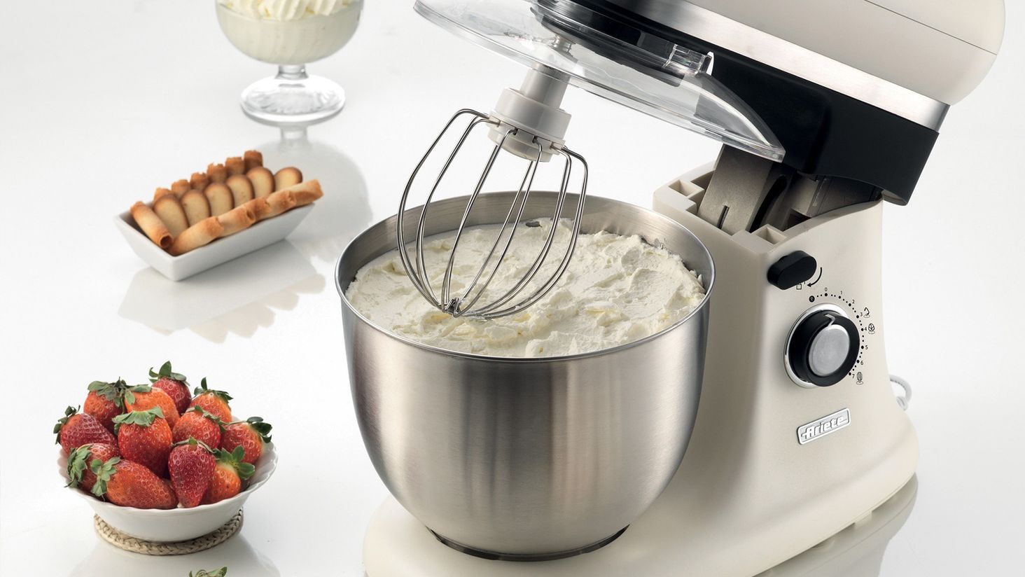 Високі швидкості планетарного робота Ariete в поєднанні з відповідним наконечником з набору - гарантують швидке і ефективне збивання твердих збитих вершків і приготування ідеальних яєчних білків для випікання смачного безе.