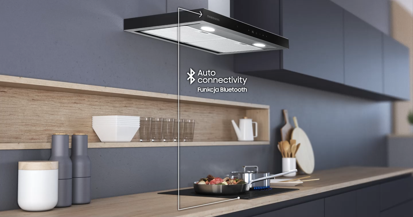 Велика зручність завдяки можливості підключення витяжки до варильної поверхні. Функція Auto Connectivity* бездротово з’єднує обидва пристрої, що означає, що витяжка вмикається автоматично, коли користувач користується плитою. Завдяки функції Bluetooth витяжка підключається до варильної панелі та автоматично вмикається при її включенні та вимикається через 10 хвилин після її вимкнення. Після підключення до плити витяжку можна контролювати та контролювати за допомогою програми SmartThings , з будь-якого місця та в будь-який час. Є можливість дистанційно регулювати потужність всмоктування витяжки, встановлювати таймер під час приготування та керувати світлодіодним освітленням.