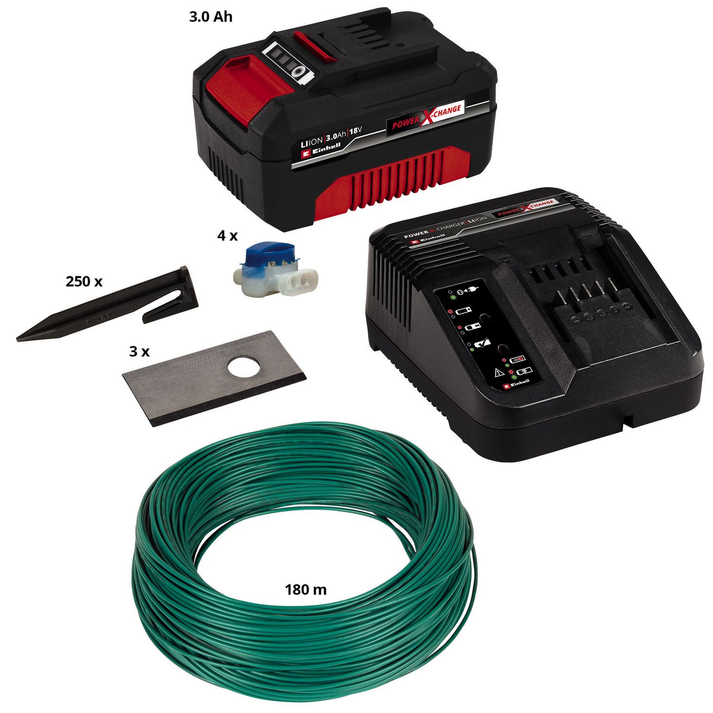 Набір для встановлення призначений для всіх моделей косильних роботів Einhell FREELEXO на основі інноваційної системи акумуляторів Power X-Change, що входить до комплекту, має ємність 3,0 А·год і зарядний пристрій для швидкої зарядки 3 А. У набір входить обмежувальний дріт довжиною 180 м, 250 монтажних гачків, 3 ріжучі леза та 4 з’єднувачі для проводів. Набір призначений для газонів площею до 800 м2.