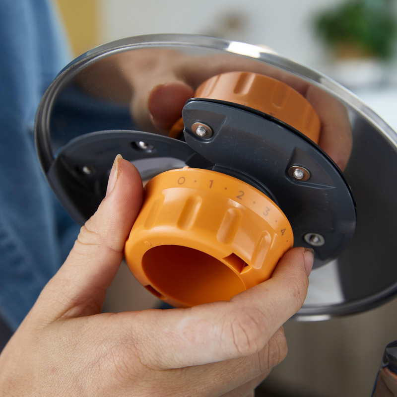 1 циферблат, 6 опцій; від дуже дрібного до дуже грубого нарізання та додаткового нарізання кубиками. Завдяки новій регульованій системі різання ви можете щоразу вибирати ідеальну товщину, вибираючи одну з шести доступних!