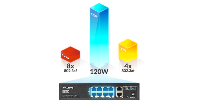 На додаток до оригінальної функції комутатора, тобто обробки трафіку кадрів Ethernet між портами, він також забезпечує живлення кожного пристрою за стандартом PoE/PoE+ – 802.3af і в. Це дозволяє живити пристрої сумарною потужністю до 120 Вт з одночасною передачею даних на них.