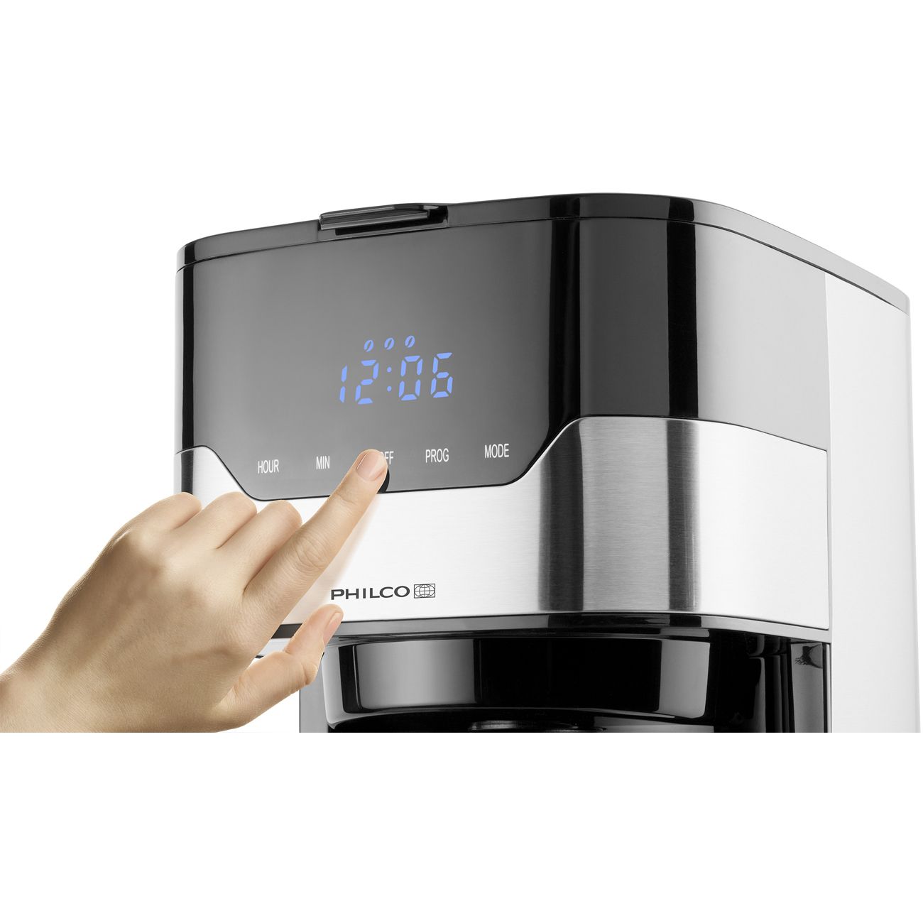 Кавоварка Philco PHCM 3000 з унікальним двостінним глечиком. Кавоварка об'ємом 1,2 л зберігає каву свіжою протягом тривалого часу і її не потрібно нагрівати. Функція Drip Stop зупиняє витікання кави при вийманні чайника. Ви можете запрограмувати приготування кави до 24 годин.
