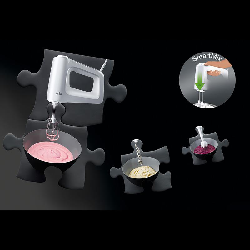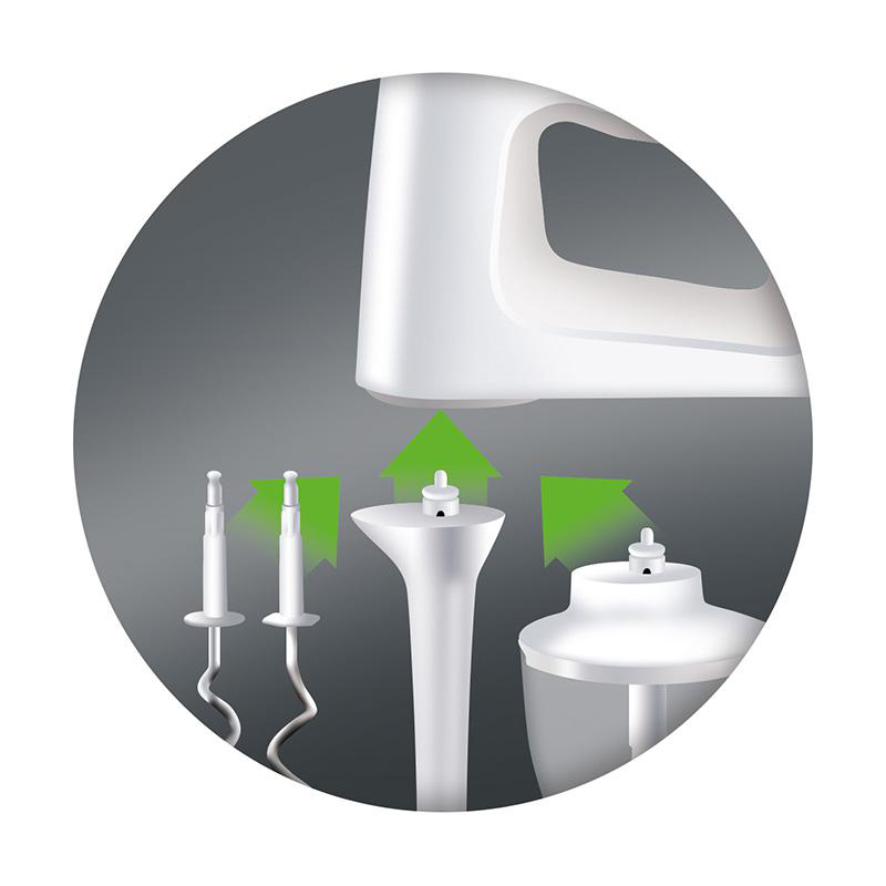 Завдяки інтелектуальному дизайну всі аксесуари ручного міксера можна інтуїтивно прикріпити спереду, забезпечуючи однакове зручне положення руки під час змішування, змішування та відпочинку, незалежно від використовуваного кріплення. Оскільки міксер стійко стоїть разом з усіма аксесуарами, робоча поверхня залишається чистою, і ви можете швидко проходити наступні етапи роботи, не роблячи перерв для чищення.