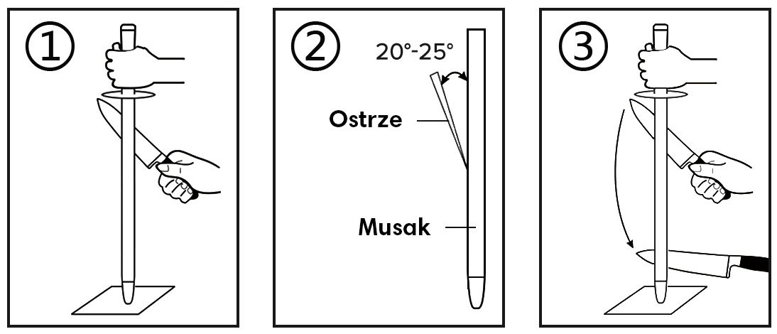 Як заточити ніж за допомогою багнета (мусака)? 1. Тримаючи рукоятку багнета лівою рукою, покладіть її на рівний стіл, а правою рукою тримайте ніж._x000D_ 2. Покладіть лезо на багнет алмазним напилком. Клинок і багнет повинні бути під кутом 20-25°. Обережно проведіть ножем вниз по дузі, від п’ятки до кінчика. Під час заточування не притискайте ніж до багнета, ведіть лезо легко і плавно._x000D_ 3. Заточуйте по черзі рівномірно з обох сторін леза. Тримайте вудку нерухомо. Рухайте ножем з одного боку багнета, а потім з іншого. Таким чином ви заточите обидві сторони леза.4. Після заточування протріть багнет сухою ганчіркою. Не мийте у воді та не використовуйте миючі засоби. Зберігайте багнет у сухому та провітрюваному місці.