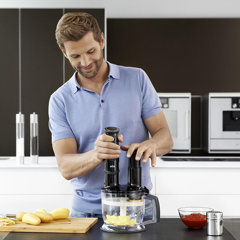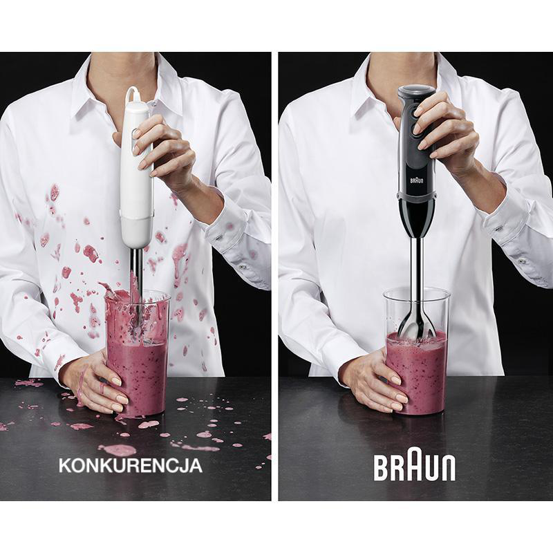 Усі ручні блендери Braun MultiQuick оснащено технологією SplashControl. Завдяки унікальній формі ніжки блендера, профільованої проти напрямку лез, технологія SplashControl забезпечує найкращі результати без безладу. Змішуйте тверді та рідкі інгредієнти, не боячись забризкати кухню.