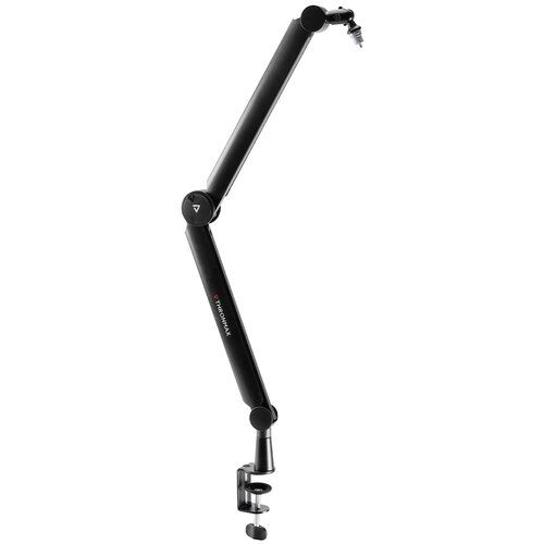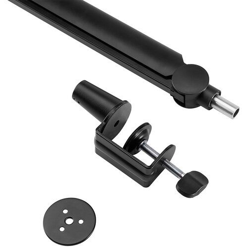 Поворотна стріла на 360° з поворотною ручкою для гнучкого регулювання кута та зсуву. Подвійна пружинна підвіска на кожній штанзі захищає мікрофон від ударів, раптових падінь і шуму. Складна конструкція ножиць забезпечує компактне зберігання та легке транспортування. Тримач мікрофона з різьбою підходить для більшості вокальних і динамічних мікрофонів.