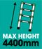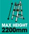 Унікальна телескопічна системаМаксимальна довжина драбини 4,4 мМаксимальна довжина драбини 2,2 мКількість сходинок: 14 Вага: 15 кг Зручна система зміни конфігурації між драбиною та драбиною Розміри в складеному вигляді: 90 x 49x18 см Вантажопідйомність: 150 кг Товщина алюмінієвих профілів: 1 , 3 – 1,5 мм