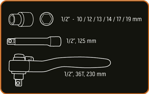 Набір торцевих ключів 1/2" NEO складається з 8 елементів, виготовлених з високоякісної хром-ванадієвої сталі. У набір входить гнута тріскачка, оснащена міцним храповим механізмом (36 зубців) і ергономічною ручкою. У комплект входить набір розеток шестигранних (розміром від 10 до 19 мм).