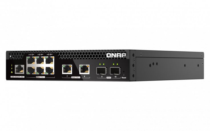 QSW-M2106PR-2S2T від QNAP — це напіввузький керований комутатор L2 PoE RACK із шістьма портами 90 Вт 2,5 GbE PoE++, двома портами 90 Вт 10 GbE PoE++ і двома оптоволоконними портами 10 GbE SFP+. QSW-M2106PR-2S2T забезпечує загальний діапазон потужності 310 Вт, що дозволяє створювати високошвидкісну і потужну мережеву інфраструктуру PoE для точок доступу Wi-Fi 6/Wi-Fi 6E/Wi-Fi 7 і маршрутизаторів QNAP Система комутаторів (QSS) із зручним веб-інтерфейсом допомагає ІТ-адміністраторам ефективно контролювати мережі рівня 2 і PoE, включаючи бездротові точки доступу, IP-камери та цифровий підпис, основні комутатори та сервери.