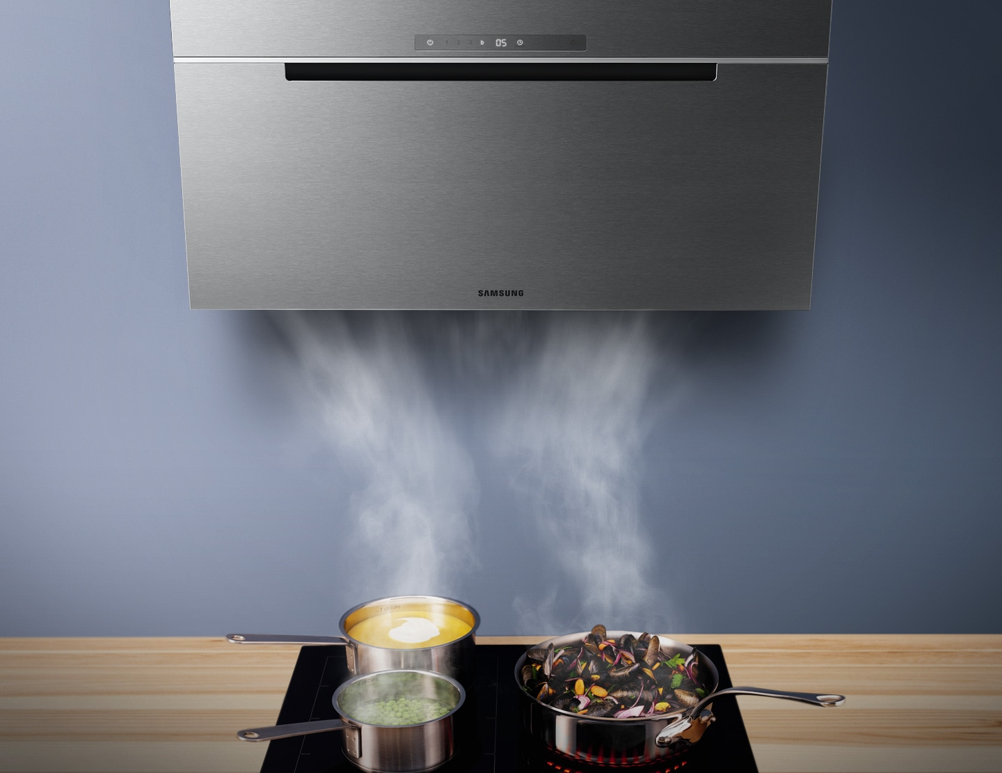 Велика зручність завдяки можливості підключення витяжки до варильної поверхні. Функція Auto Connectivity* забезпечує бездротове з’єднання обох пристроїв, що означає, що витяжка вмикається автоматично, коли користувач користується плитою. Завдяки функції Bluetooth витяжка підключається до варильної панелі та автоматично вмикається при її включенні та вимикається через 10 хвилин після її вимкнення. Після підключення до плити витяжку можна контролювати та контролювати за допомогою програми SmartThings , з будь-якого місця та в будь-який час. Є можливість дистанційно регулювати потужність всмоктування витяжки, встановлювати таймер під час приготування та керувати світлодіодним освітленням.