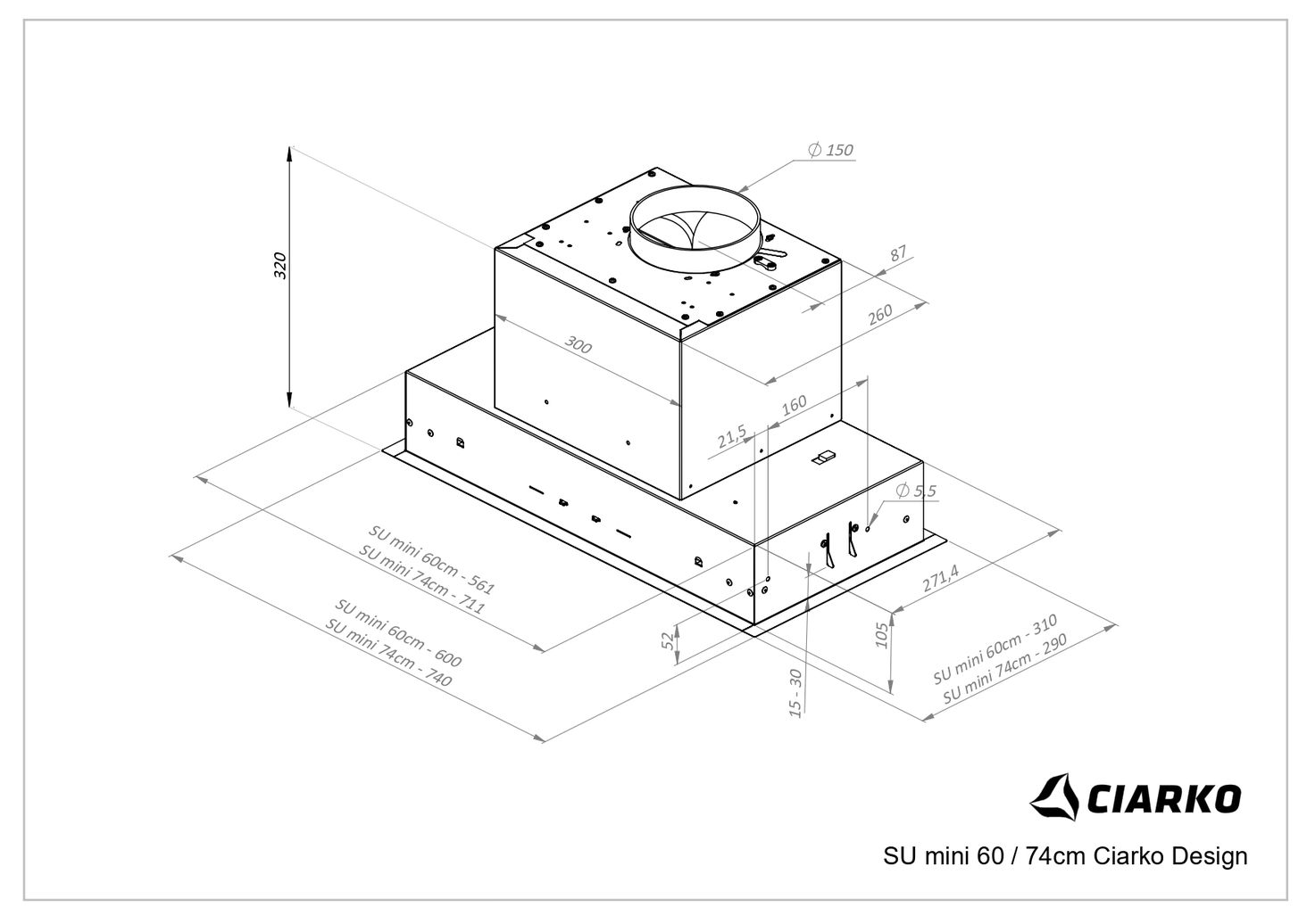 Мінімальна-максимальна висота 320 мм Ширина Su Mini 60 - 600 мм / Su Mini 74 - 740 мм Глибина Su Mini 60 - 310 мм / Su Mini 74 - 290 мм Вага нетто Su Mini 60 - 9,1 кг / Su Mini 74 - 12 кг Клас енергоспоживання І Мін. відстань від електричної плити 55 см Мін. відстань від газової плити 65 см Діаметр виходу повітря 15 см Потужність двигуна 160 Вт Потужність освітлення 8 Вт Загальна потужність 168 Вт Довжина електричного кабелю 2 м Рівень шуму min-max (boost) Su Mini 60 43-62 (68) дБ