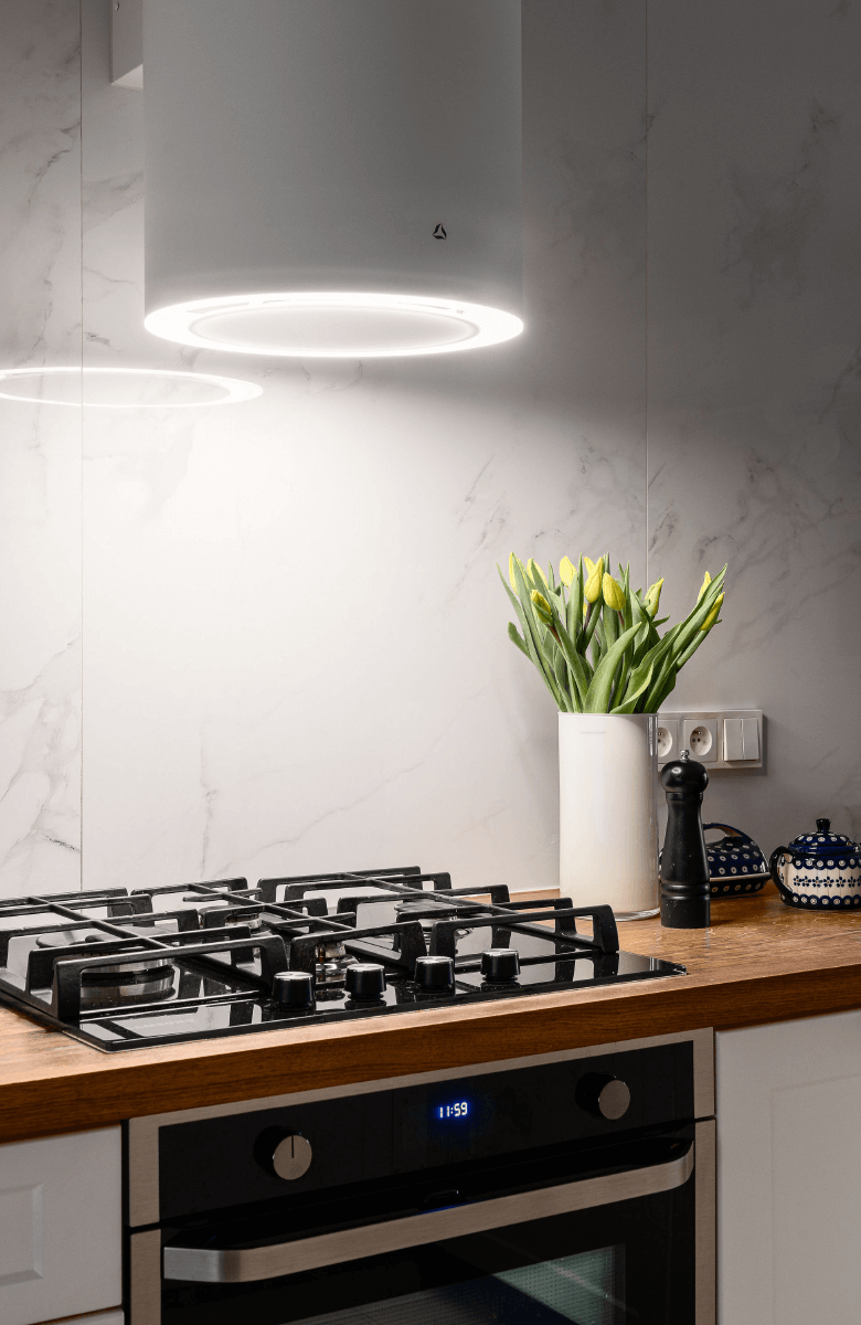 Циліндричне освітлення Warm2ColdLED. Світлодіодна лампа у формі кола чудово освітлює варильну поверхню та забезпечує дуже хороші умови для приготування їжі. _x000D_ Регульований колір освітлення - від теплого до холодного - дозволяє підібрати освітлення до інших ламп або до переважаючого настрою (2900K - 6000K).