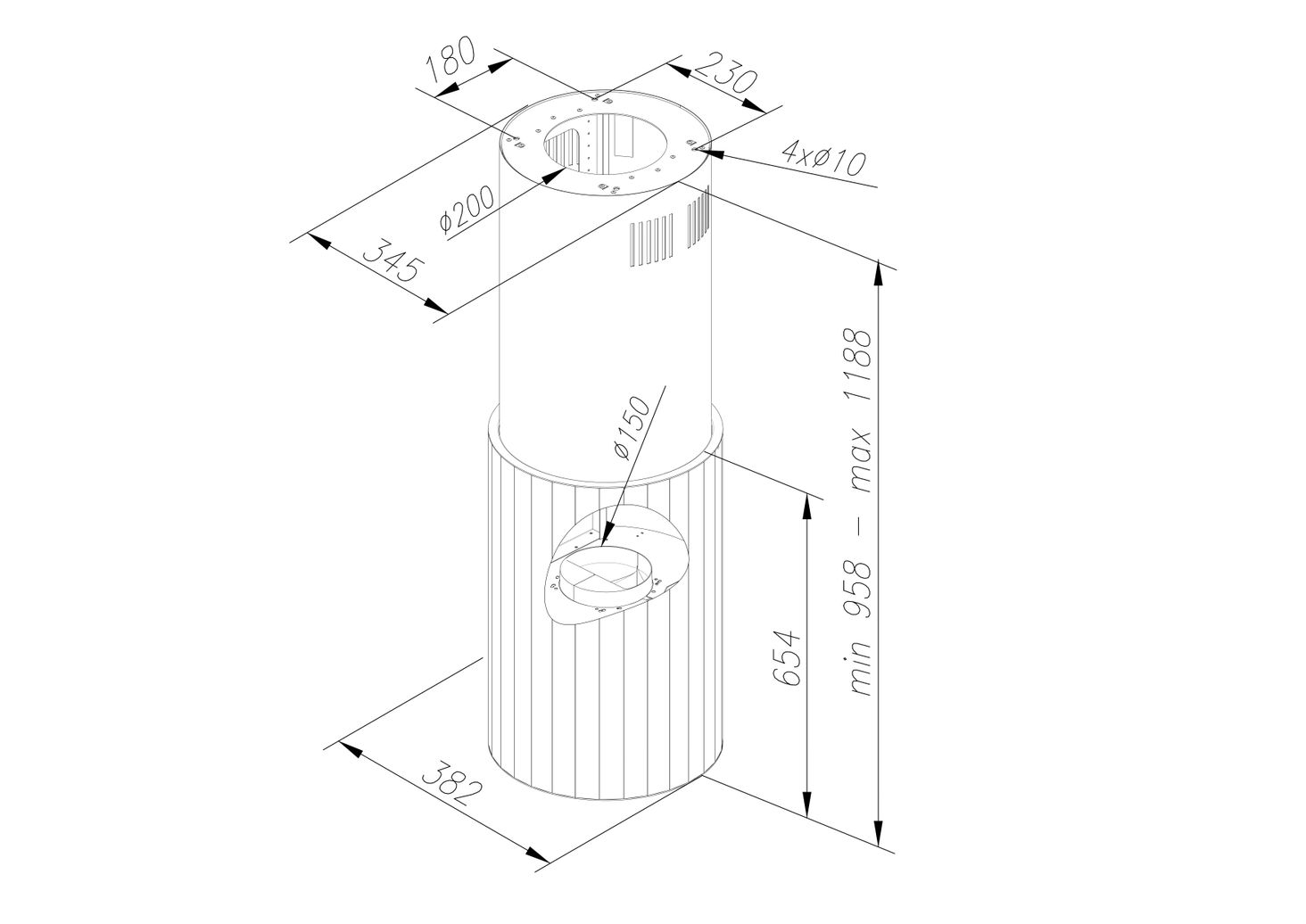 Висота 958-1188 мм Ширина 382 мм Глибина 382 мм Вага нетто 20,5 кг Клас енергоспоживання І Мін. відстань від електричної плити 55 см Мін. відстань від газової плити 65 см Діаметр виходу повітря 15 см Потужність двигуна 160 Вт Потужність освітлення 14 Вт Загальна потужність 174 Вт Довжина електричного кабелю 2 м