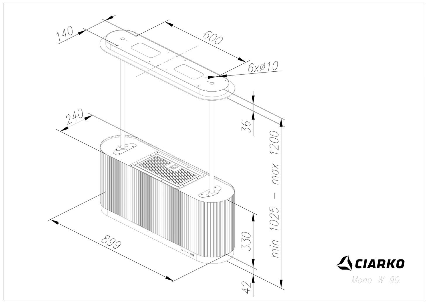Висота 1025-1200мм Ширина 900 мм Глибина 240 мм Вага нетто Клас енергоспоживання A+ Мін. відстань від електричної плити 55 см Мін. відстань від газової плити 65 см Діаметр виходу повітря 15 см Потужність двигуна 170 Вт Потужність освітлення 10 Вт Загальна потужність 180 Вт Довжина електричного кабелю 2 м