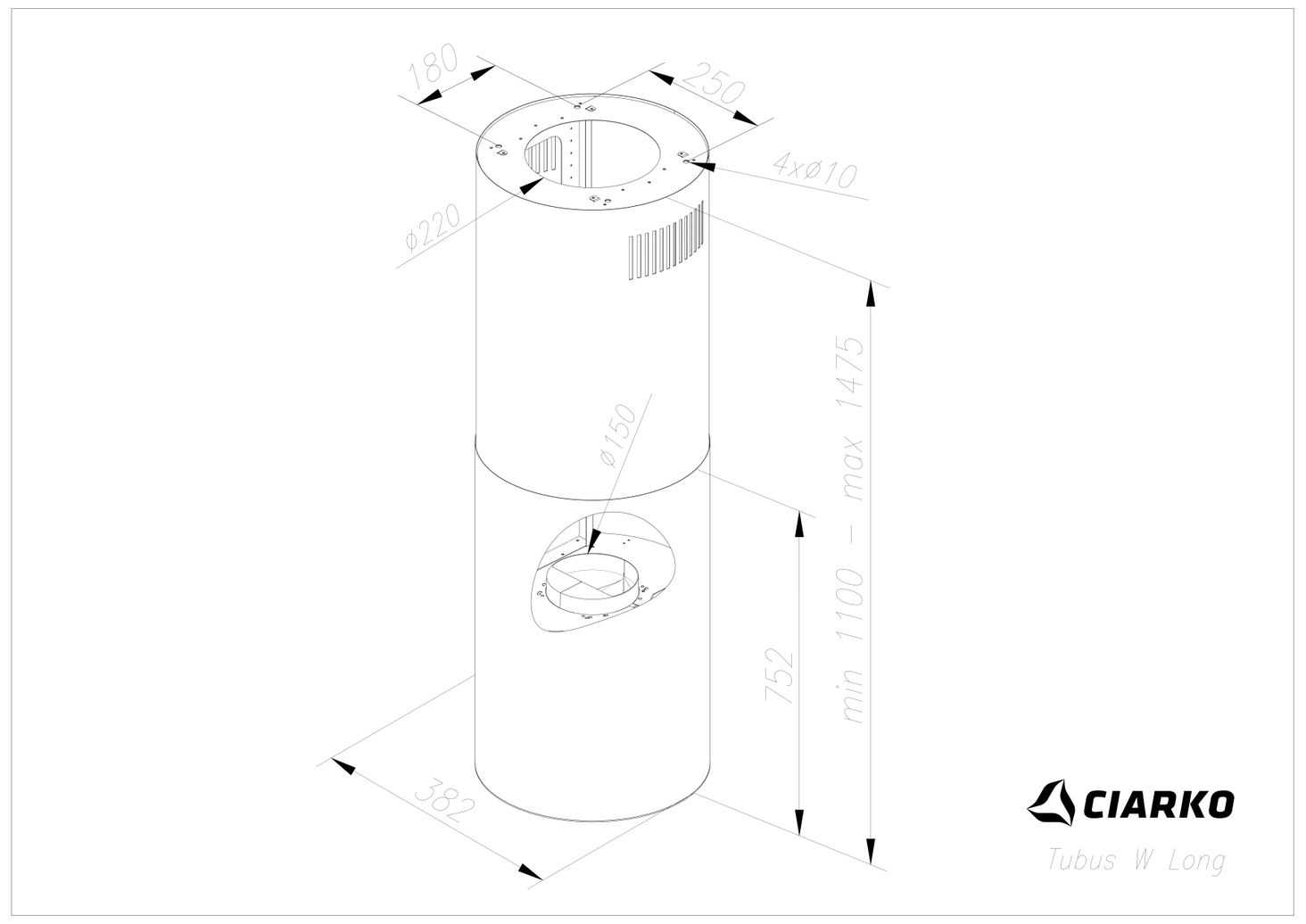 Висота 1100-1475мм Ширина 382 мм Глибина 382 мм Вага нетто 22,3 кг Клас енергоспоживання І Мін. відстань від електричної плити 55 см Мін. відстань від газової плити 65 см Діаметр виходу повітря 15 см Потужність двигуна 160 Вт Потужність освітлення 14 Вт Загальна потужність 174 Вт Довжина електричного кабелю 2 м