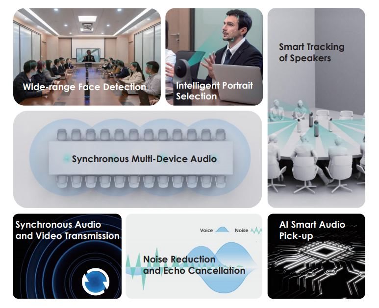 Нові функції для покращення зустрічей і конференцій За допомогою нової функції декілька підрозділів Kandao можуть працювати разом. За допомогою програмного забезпечення Kandao Meeting Omni, яке можна безкоштовно завантажити з веб-сайту виробника, можна з’єднати разом до 4 пристроїв Meeting Pro. Завдяки цьому можна комфортно охопити велику кімнату для переговорів. Алгоритм Kandao Meeting AI 4.0 забезпечить ширший діапазон інтелектуального відстеження виступаючих. Це запропонує вам досвід спілкування віч-на-віч. Також можна скористатися перемиканням режиму зустрічі, що дозволить виділити активного спікера або вибрати кут огляду екрана.