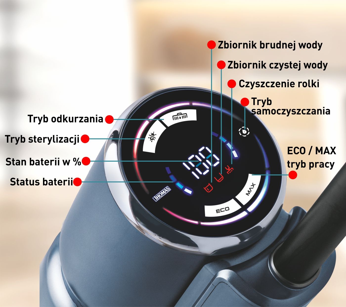 Пилосос Thomas Aqua Floor Cleaner Plus оснащений великим і функціональним дисплеєм Smart LED, який покаже вам стан усіх функцій. Він також попередить вас, якщо незабаром потрібно буде зарядити батарею, і повідомить про необхідність заміни води.
