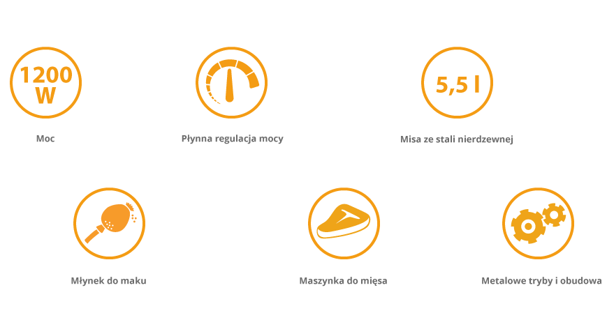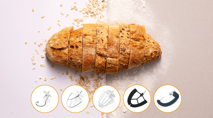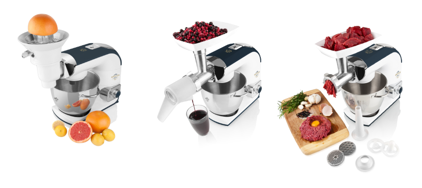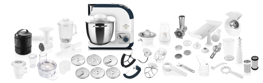 Простора чаша полегшує ідеальне замішування тіста, після чого тісто може підніматися прямо в ній. У набір входить гак для замішування та тіста, кремомішалка, віночок і гак для безглютенового тіста.