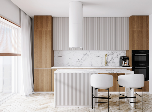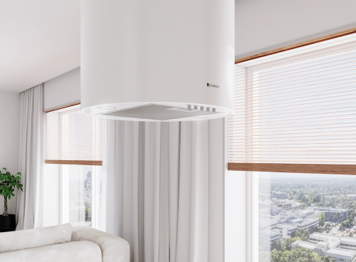 Витяжка Lobelio White виконана в елегантному білому відтінку. Розташований над кухонним островом, він доповнить обстанов