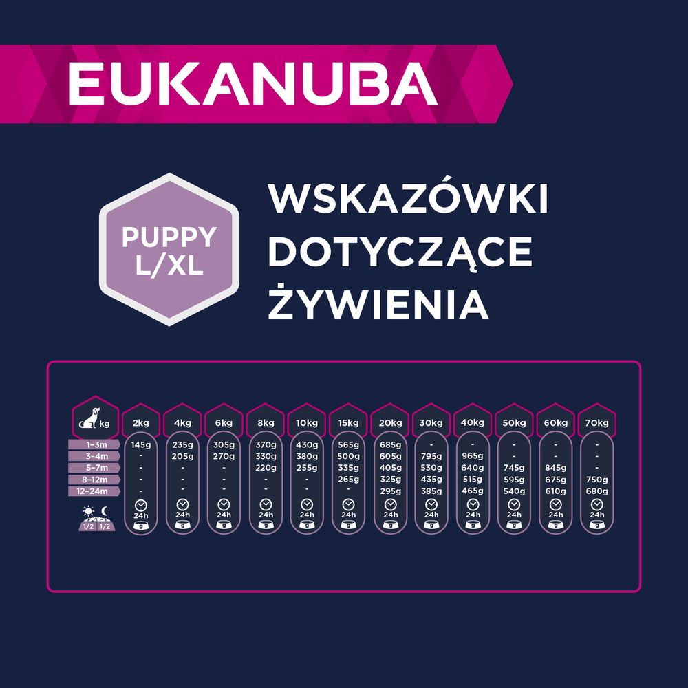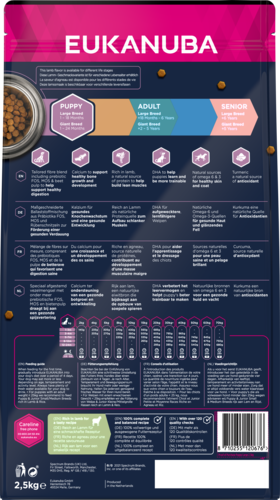 На вас і вашого цуценя чекає багато пригод. Ви можете змусити його повноцінно насолоджуватися життям протягом усієї молодості - завдяки високоякісному корму, який задовольнить усі потреби вашого вихованця. Сухий гранульований корм Eukanuba, багатий бараниною та рисом, ідеально підходить для підростаючих цуценят собак великих порід віком 1-12 місяців. Особливо підходить для цуценят із чутливим шлунком, оскільки високоякісна ягнятина та рис дійсно легко засвоюються. Спеціально адаптована суміш клітковини з пребіотиками та буряковим жомом також сприяє здоровому травленню. Він також містить природні джерела глюкозаміну та кальцію, які допомагають підтримувати здоров'я суглобів і міцних кісток, щоб цуценята могли насолоджуватися активним життям. Курка є ще одним джерелом білка, поряд з бараниною, що допомагає собакам розвинути міцні м’язи. Сухий корм Eukanuba також містить L-карнітин. Ця сполука сприяє зменшенню жирової тканини в організмі. Ваше цуценя може підтримувати оптимальну вагу, і його суглоби менше навантажуються. Унікальні кубічні гранули корму Eukanuba забезпечать чисті здорові зуби на довгий час. Гранули Eukanuba також підтримують здорову шкіру та блискучу шерсть завдяки природним джерелам омега-6 та омега-3 жирних кислот. Вони також допомагають зменшити линьку у цуценят. Сухий корм Eukanuba, збагачений куркумою, природним джерелом антиоксидантів, також зміцнює імунітет. Ця їжа на 100% повноцінна і збалансована. Завдяки високому вмісту ягняти та рису корм Eukanuba ідеально підходить для вирощування цуценят великих порід, таких як німецькі вівчарки, лабрадори, ротвейлери та золотисті ретривери.