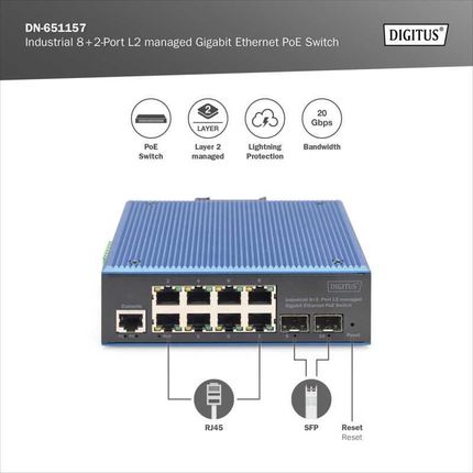 Комутатор DIGITUS Przemysłowy przełącznik Gigabit Ethernet PoE, 8+2 porty, zarządzalny na warstwie łącza danych (L2) DN-651157