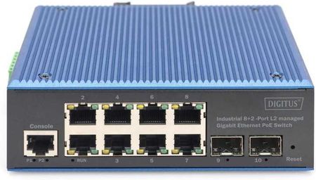 Промисловий керований 10-портовий мережевий комутатор Gigabit Ethernet PoE DIGITUS - 8X RJ45 + 2X SFP Uplink - 1 консольний порт - бюджет PoE 30 Вт на порт RJ45 - керований L2 - монтаж на рейці