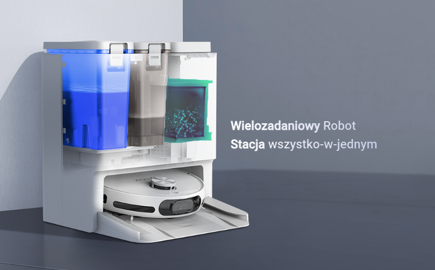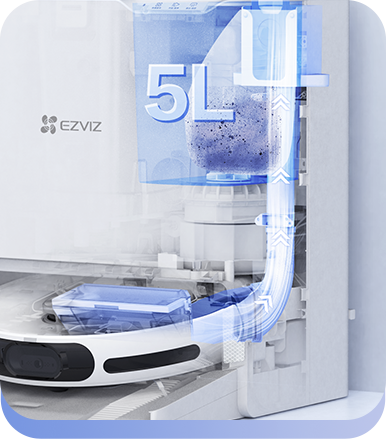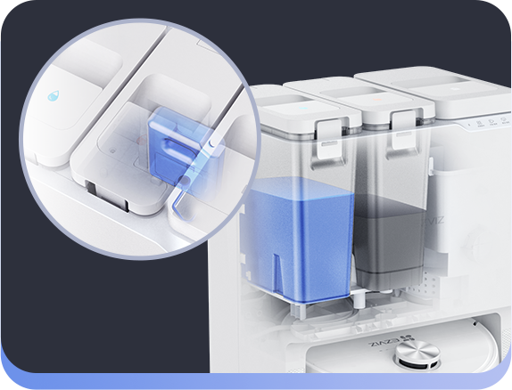 Док-станція має резервуар для чистої води об’ємом до 5 літрів. Після прибирання підлоги робот автоматично наповнюється свіжою водою та миючим засобом, щоб бути готовим до наступного прибирання.