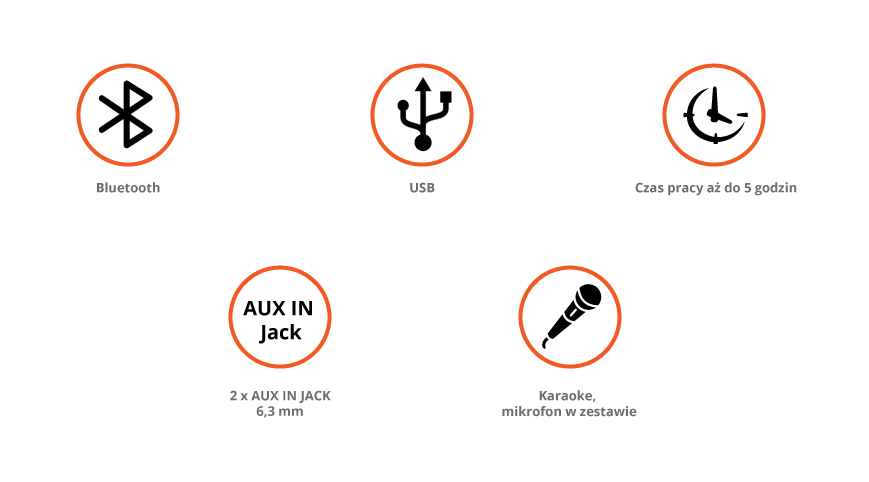 BluetoothDigital FM-тюнер із пам’яттю на 30 станцій, караоке, мікрофон у комплекті2 x USBAUX IN Гніздо 3,5 мм2x AUX IN Гніздо 6,3 мм (мікрофон) Вбудований акумулятор Час роботи до 5 годин