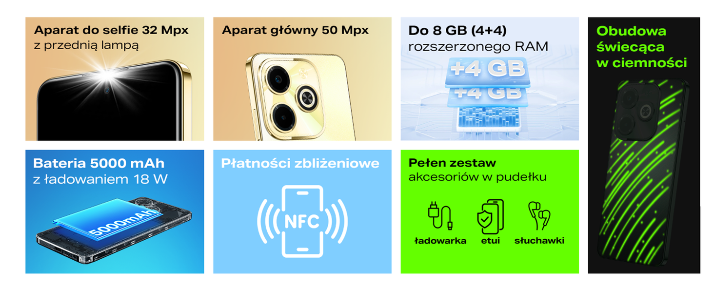 Смартфон HOT 40i у версії Starfall Green оснащений корпусом, який світиться в темряві.