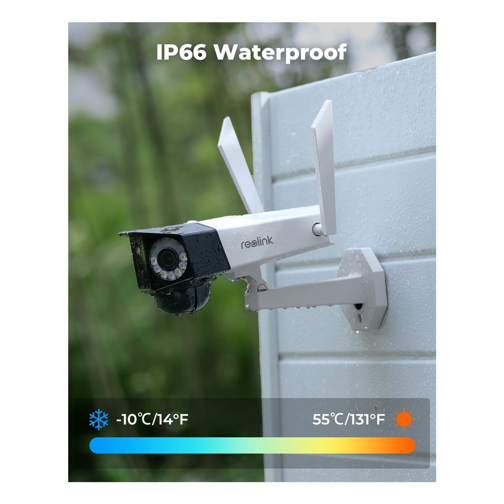 Камера Reolink Dual 2 WiFi має підвищений захист за стандартом IP66. Таким чином, IP-камера може витримувати суворі погодні умови, включаючи дощ, сніг, сильний холод і спеку.