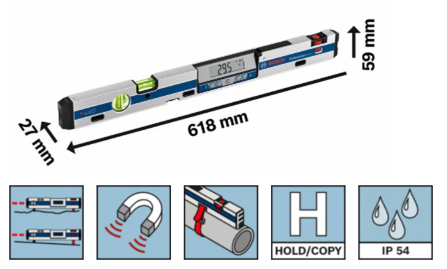 Довжина: 60 см Діапазон вимірювання: 0 – 360° (4 x 90°) Точність електронних вимірювань 0°/90°: ±0,05° Електронна точність вимірювання в діапазоні 1 – 89°: ± 0,1° Робочий діапазон (лазер): 30 м Приблизна вага: 0,91 кг Тип лазера: 635 нм, < 1 мВт Радіус дії лазера: 30 м Лазерний клас: 2 Точність нівелювання, лазер: ± 0,5 мм/м Одиниці вимірювання: °, %, мм/м Підключення штатива: 1/4"