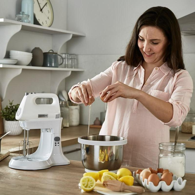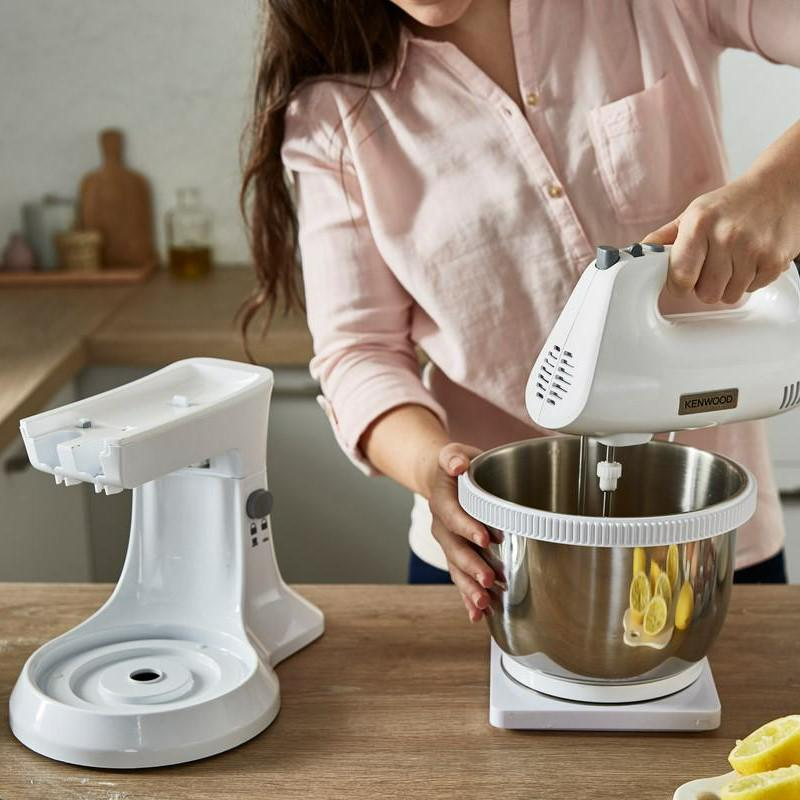 Пристрій чудово працює як практичний окремий ручний міксер, який можна використовувати з різними контейнерами. Якщо ви бажаєте мати вільні руки під час готування, приєднайте міксер до робочої чаші, що обертається, і вільно додавайте інгредієнти.