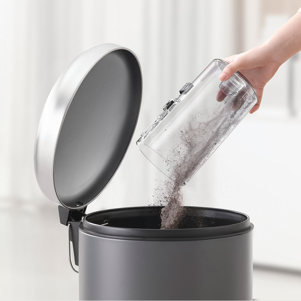 Контейнер для пилу об'ємом до 0,8 л Легко спорожняється, без контакту з брудом. Просто натисніть кнопку і висипте вміст у кошик. Ви можете вийняти контейнер, не виймаючи трубку з пилососа, і промити його у воді, як і мультициклонну систему та фільтр.