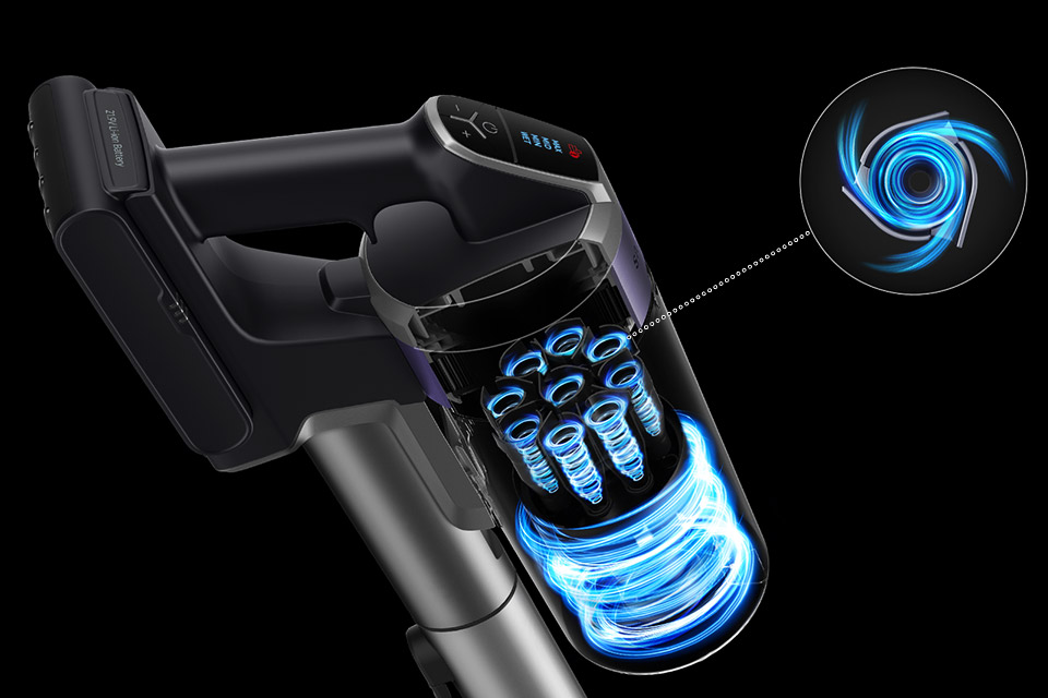 Висока потужність двигуна до 550 Вт* забезпечує ефективне прибирання будь-якої поверхні, тож він справляється як з товстими килимами, так і з твердою підлогою. Двигун Digital Inverter** і технологія Jet Cyclone, яка оптимізує потік повітря, забезпечують стабільно високу потужність всмоктування.