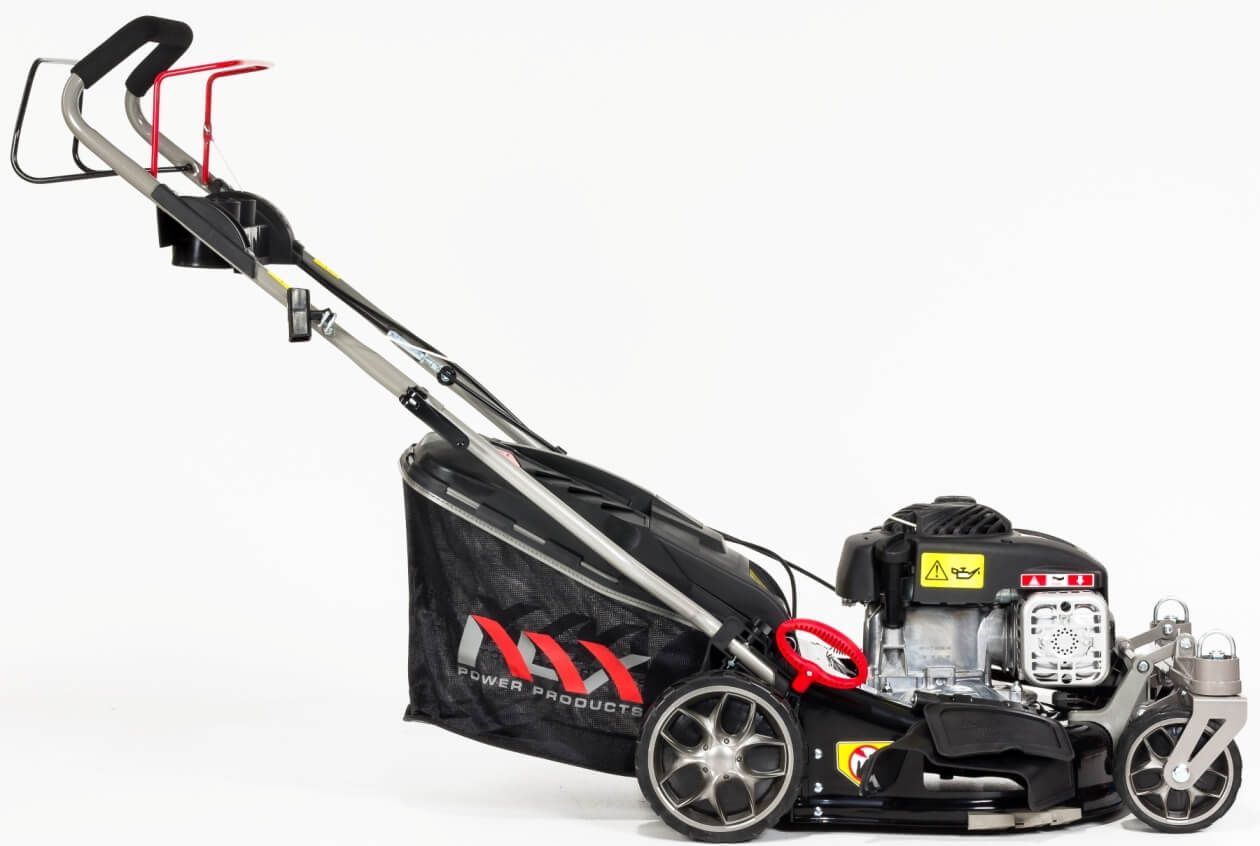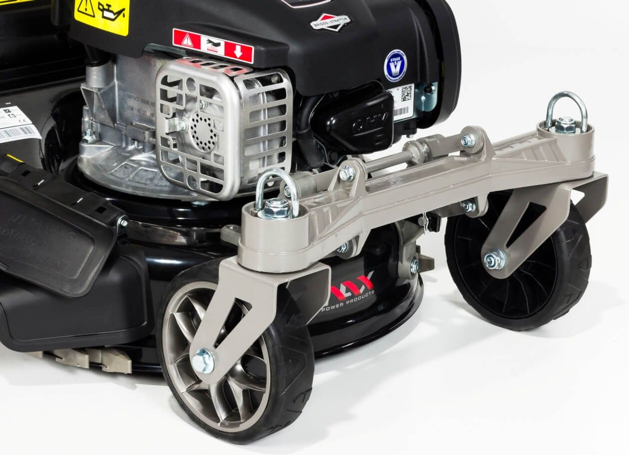 Колеса з шарикопідшипниками - опір коченню було максимально зменшено, косарка залишатиметься стабільною навіть після багатьох років використання. Великі задні колеса діаметром 20 см полегшують керування косаркою на складній місцевості. Розмір переднього колеса – 15 см.