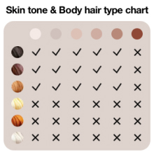 Прилад підходить для шкіри різного кольору - від світлого до середньо темного - з волоссям різних відтінків, від натурального русявого до темно-коричневого або чорного. Технологія IPL менш підходить для світло-русяве, руде, сиве та біле волосся, оскільки вони містять менше меланіну, який поглинає світло.