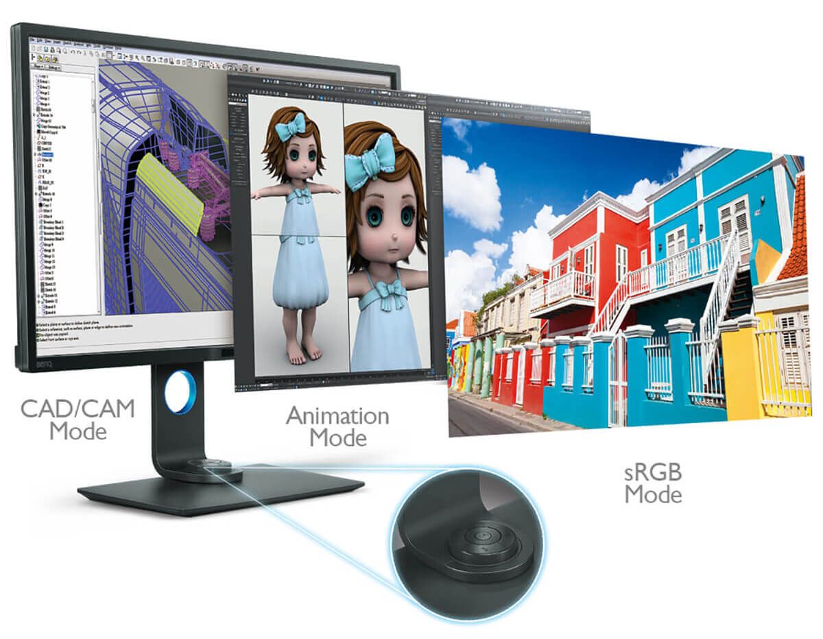 Перемикайтеся між режимами CAD/CAM, анімацією та темною кімнатою простим натисканням кнопки на селекторі режиму монітора Hotkey Puck. Налаштуйте кнопки для відображення інших режимів або параметрів екранного меню, таких як яскравість і контраст.