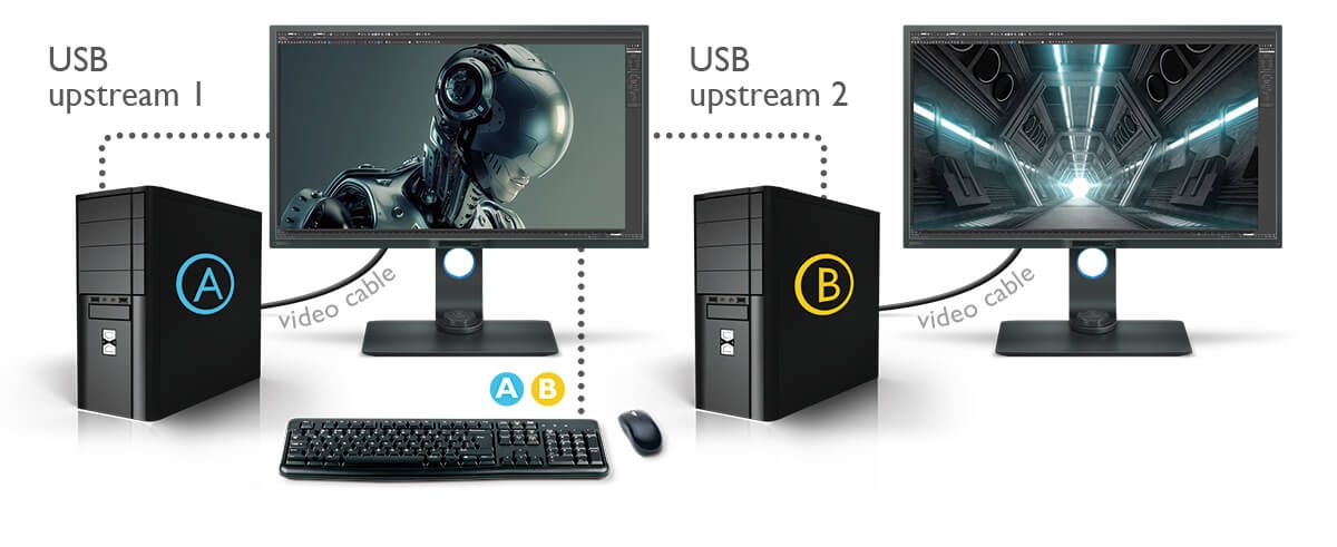 Функція перемикання KVM дозволяє користувачам відображати та керувати вмістом із двох різних комп’ютерних систем на одному екрані за допомогою однієї клавіатури та миші, щоб заощадити місце та підвищити ефективність роботи.