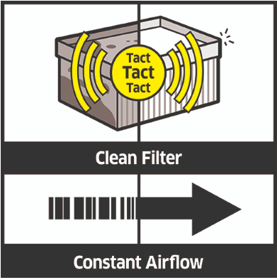 Система автоматичного очищення фільтра Tact² Система почергово струшує половину фільтра кожні 7 секунд, що ефективно запобігає падінню потужності всмоктування під час роботи. Підтримується постійний потік повітря