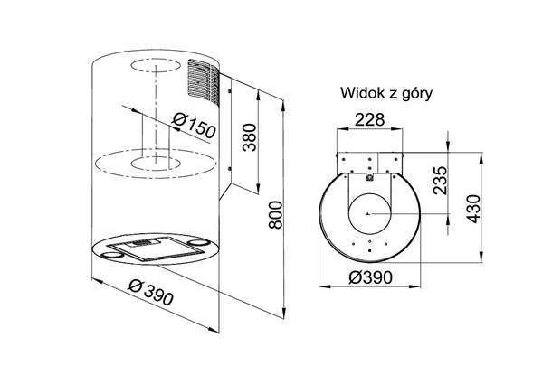 Капюшон має діаметр 39 см і висоту 70 см. Продуктивність 605 м3/год робить витяжку ідеальною як для закритої, так і для відкритої кухні. Він може працювати як екстрактор або абсорбер в замкнутому контурі - потрібна установка вугільних фільтрів FDUEEL.